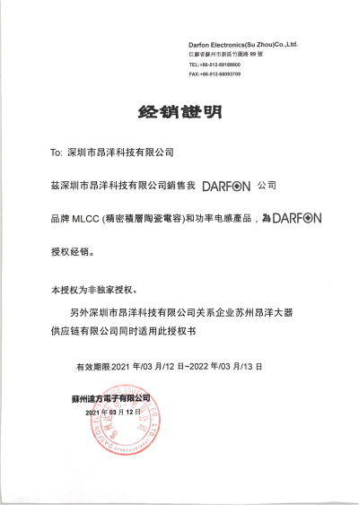 特點(diǎn)一:達(dá)方電阻代理商擁有授權(quán)證書(shū)
